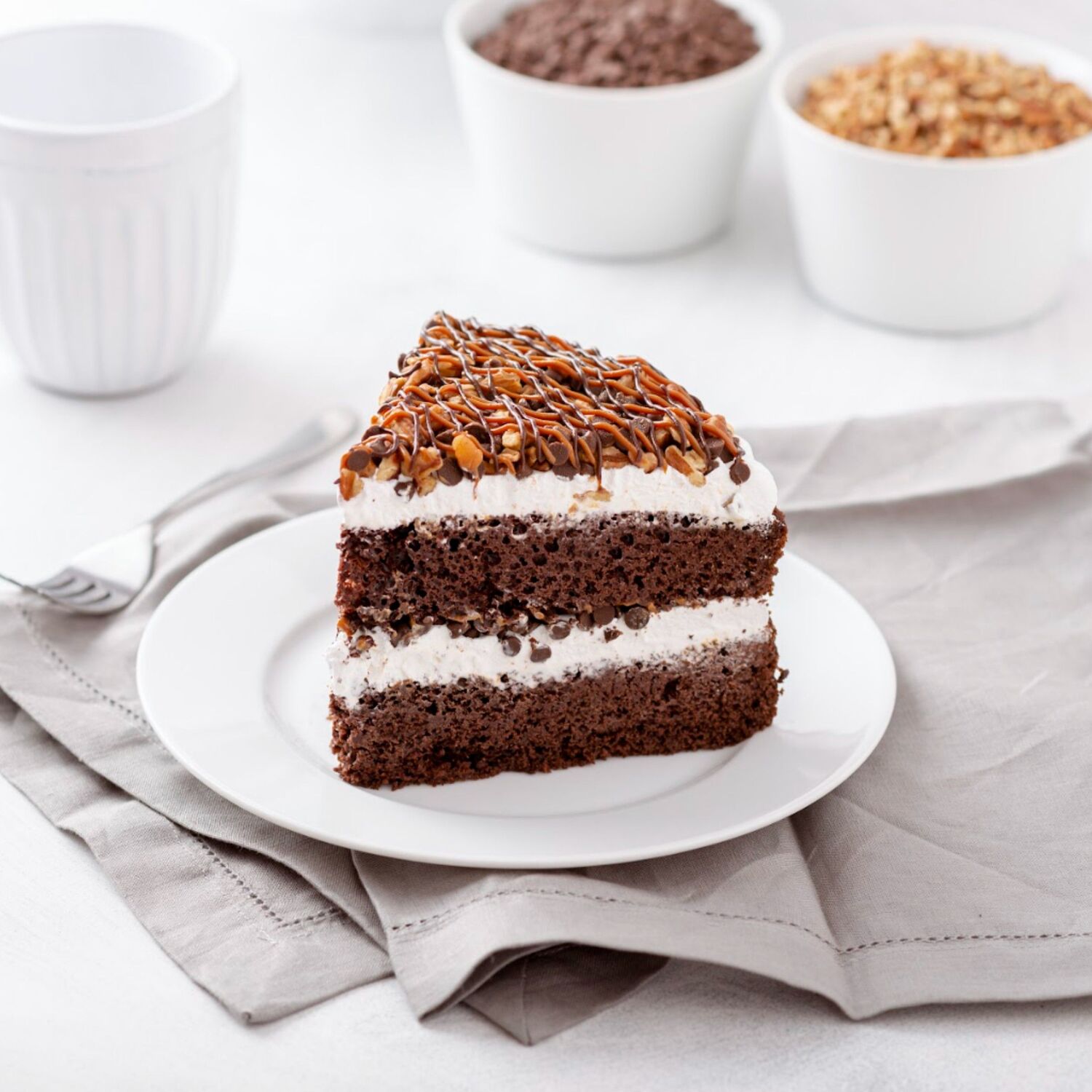 Exquisito pan de chocolate dividido en dos capas cubierto de crema chantilly, decorado con choco-chispas, nuez, lineas de cajeta y chocolate.(RINDE DE 12 a 14 REBANADAS)